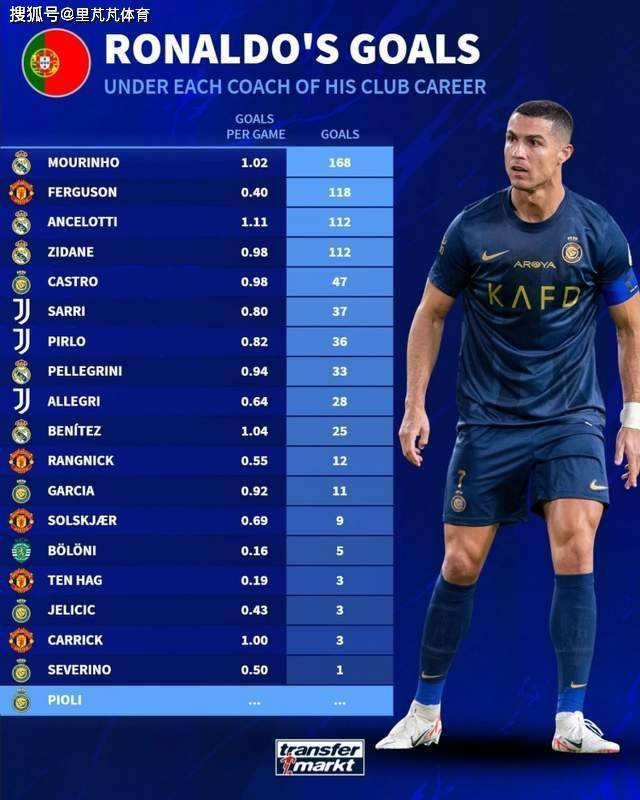 利雅得胜利官宣,皮奥利上任成为球队主帅。德转统计了C罗俱乐部生涯在历任主帅执教下的进球数和场均进球数,穆里尼奥执教下168球最多。