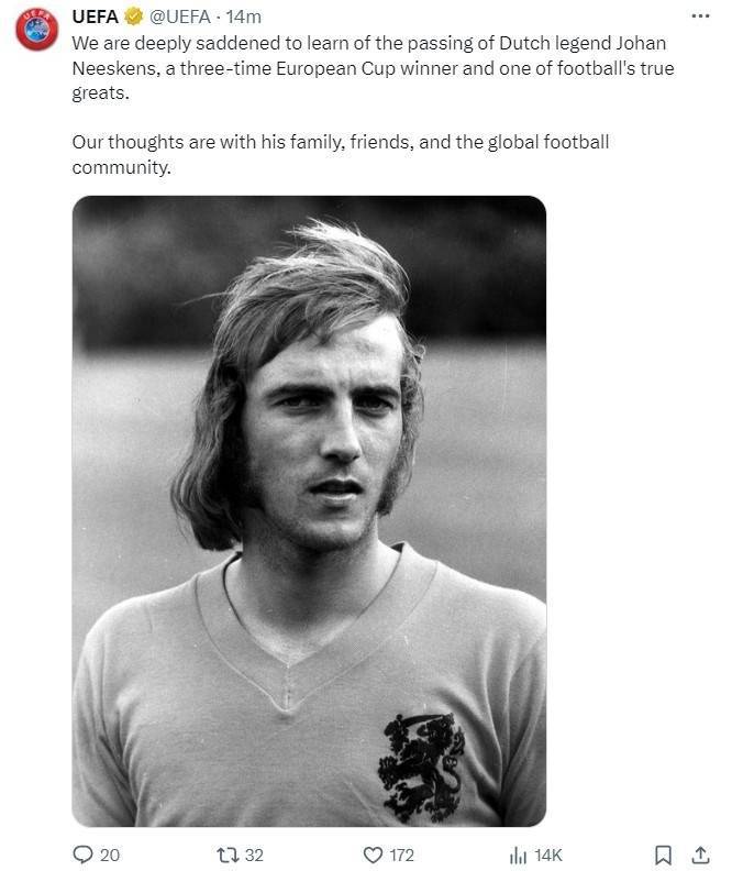 欧足联官方表示道:我们对荷兰传奇人物约翰-内斯肯斯的逝世深感悲痛,他是三届欧冠冠军,也是足坛真正伟大的球员之一。我们与他的家人、朋友以及全球足坛同仁同在。