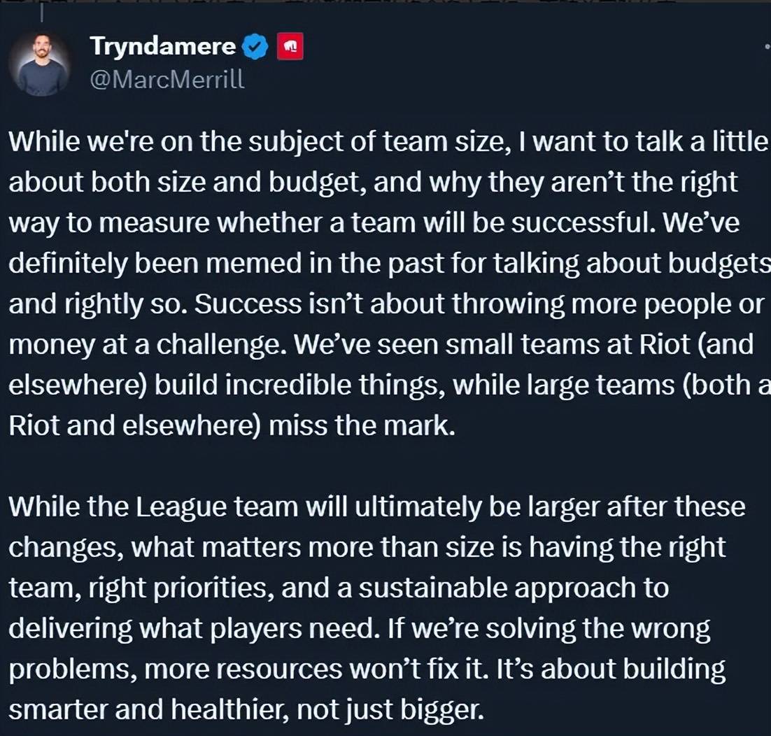 拳头游戏公司联合创始人、联合主席兼首席产品官Tryndamere,今日在社交媒体正式公布,将会对公司进行新一轮裁员。对于这个消息,玩家们的关注度颇高。大伙第一时间想到的,当然是此次裁员是否会对游戏内容造成影响。