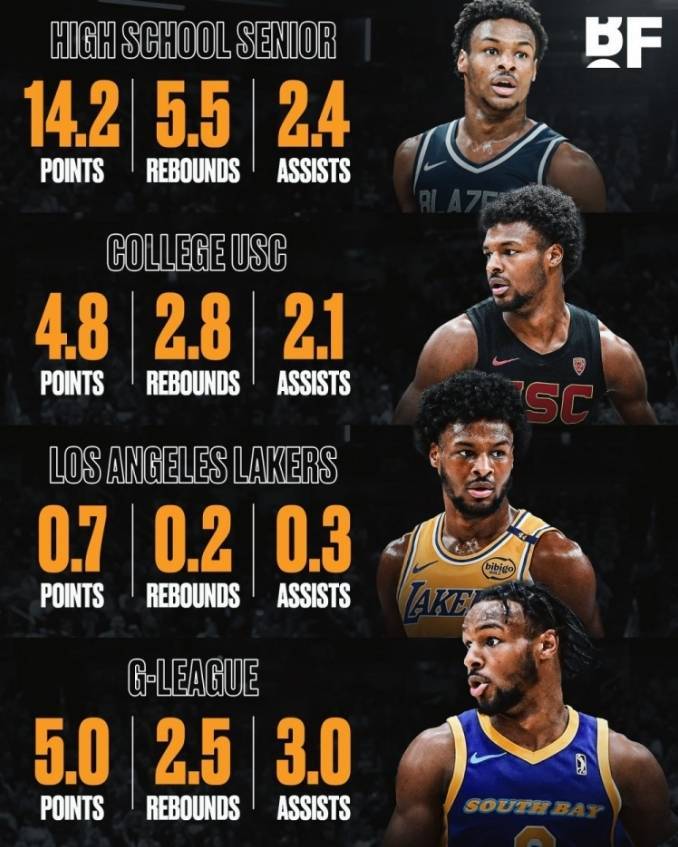 北京时间2024年11月29日,美媒晒出了布朗尼-詹姆斯生涯每个阶段的数据。