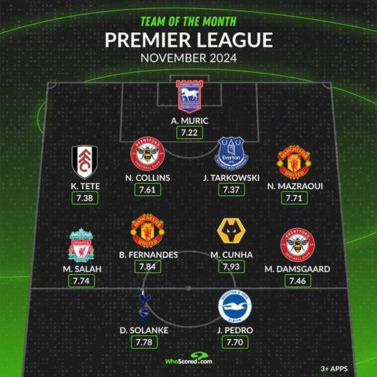 直播吧12月2日讯 WhoScored根据球员评分列出了英超11月最佳阵容,萨拉赫、B费、马兹拉维在列。